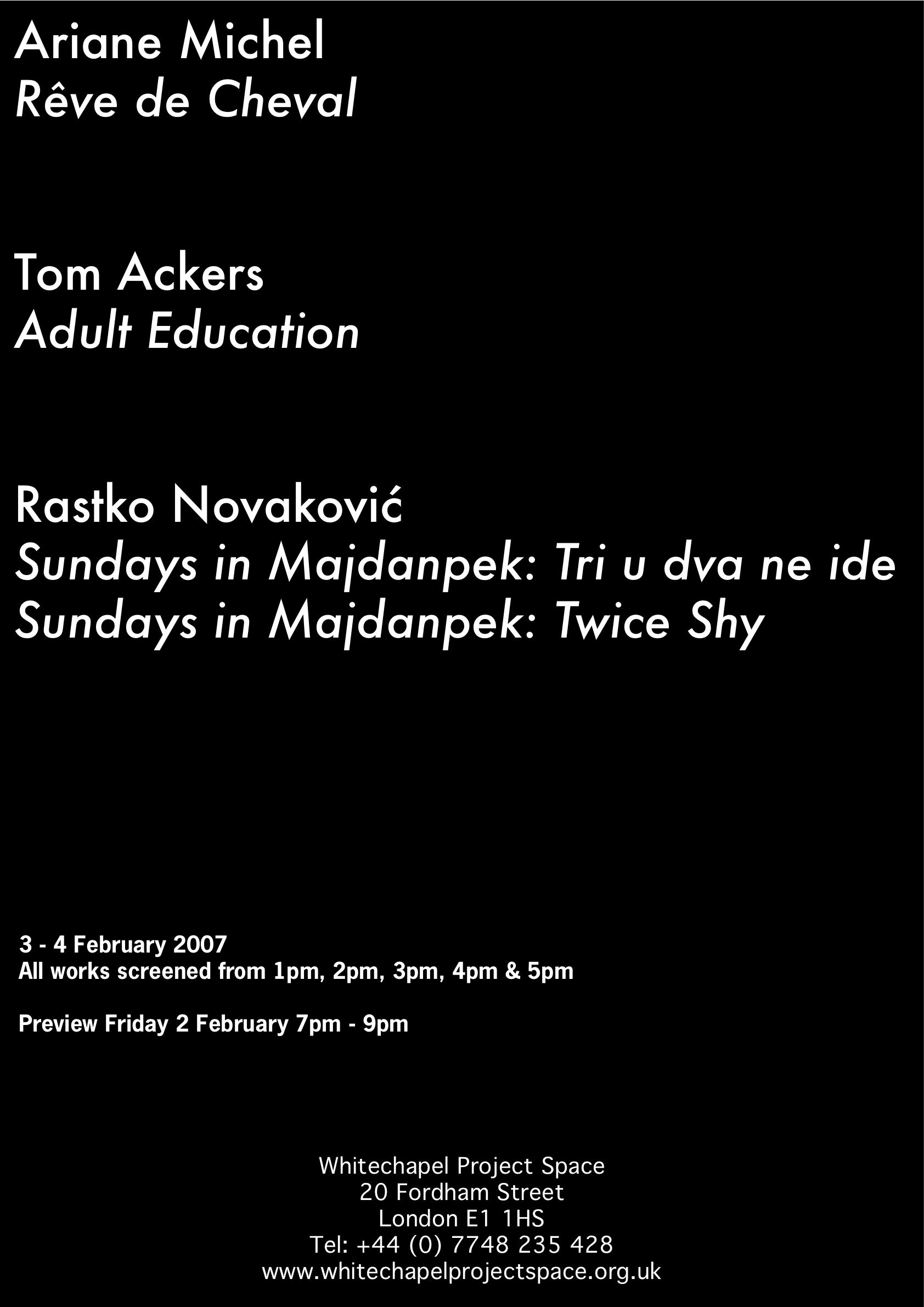 ARIANE MICHEL / TOM ACKERS / RASTKO NOVAKOVIC Recent videos Preview Fri 2 February 19:00 - 21:00 ------------------------------------------------- ARIANE MICHEL Rêve de Cheval (Horse Dream) (2004) 11 minutes Here they are, sleeping. From one leg onto the other, strong and quiet, hidden in the winter. From far away, a rumour comes up. Ears straighten-up: all of them have heard. In their secret language, they all come to an agreement: they are scared and have to run away. A weird animal will appear in their panic, hybrid, worrisome like an enigma. TOM ACKERS Adult Education (2006) 16 minutes A series of scenarios present Cognitive Behavioural Therapy as a site for different levels of performing. Actors devise a range of roleplaying characters, and in various presentations of themselves arouse confusions of perception, self-knowledge and self-alteration around their use or avoidance of cliché. RASTKO NOVAKOVIC Sundays in Majdanpek: Tri u dva ne ide (2006) Five shots of the town's disused cinema present a fleeting document of the social space and history of Majdanpek, a devastated mining town in Eastern Serbia. The cyclical gesture of entering the cinema, the expectations in starting afresh, tracing the same route, but each time with different images and sounds, creates an accumulative intermingling of textual and visual historical records. They present simultaneously two contradictory conceptions of history: history as a narrative and history as that which is recorded in a particular medium. A single uninterrupted shot of Majdanpek's open mine in 4:3 aspect ratio is tilted so that its diagonal fits the 16:9 format - stretching the tension between home video and cinema, the public and private, the lived and the represented, off-screen space and the proscenium. The contradiction between place and sound, and the structurally warped projection of this industrial landscape, elicits an archaeological texture that shifts between dialectical materialism and spiritual meditation. - Ariane Michel was born in Paris in 1973, and studied at l'Ecole Nationale Supérieure des Arts Décoratifs. Solo shows include Atelier du Jeu de Paume, Paris 2006, and Galerie Où, Marseille, 2005. Her feature length film ' Man On Land ' won the Grand Prize French Competition, FID Marseilles , and will be on general release in France during 2007. Upcoming screenings include at the International Film Festival Rotterdam 2007, and Festival of Nonfiction Film, MOMA, New York. She lives in Paris - Tom Ackers was born in Hong Kong in 1978, and studied at The Slade School of Fine Art London, and Hunter College, New York. Previous shows include Atelier Something, London, 2001 and Garba04, Montescaglioso, Italy, 2004. He lives in London. - Rastko Novakovic was born in Belgrade in 1981, and studied at the University of Westminster. He is a founding member of Lab no.w.here and Free Cinema Seven . He lives in London. Ariane Michel is represented by Jousse-Entreprise Gallery, Paris, France |