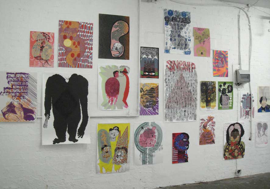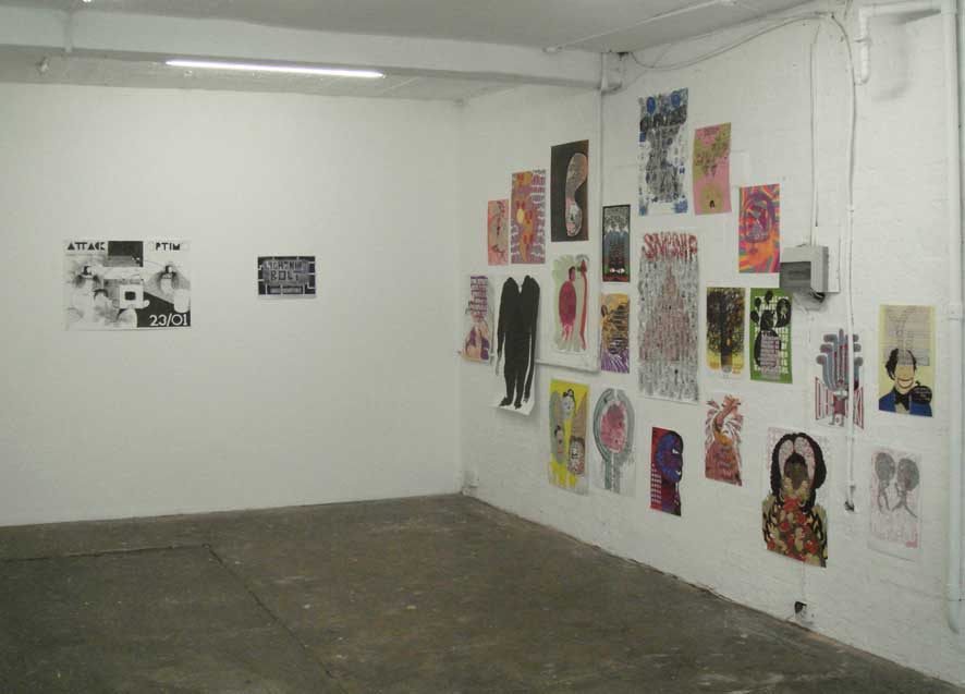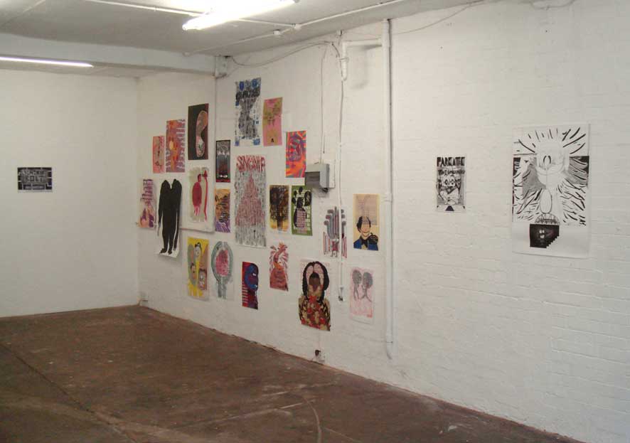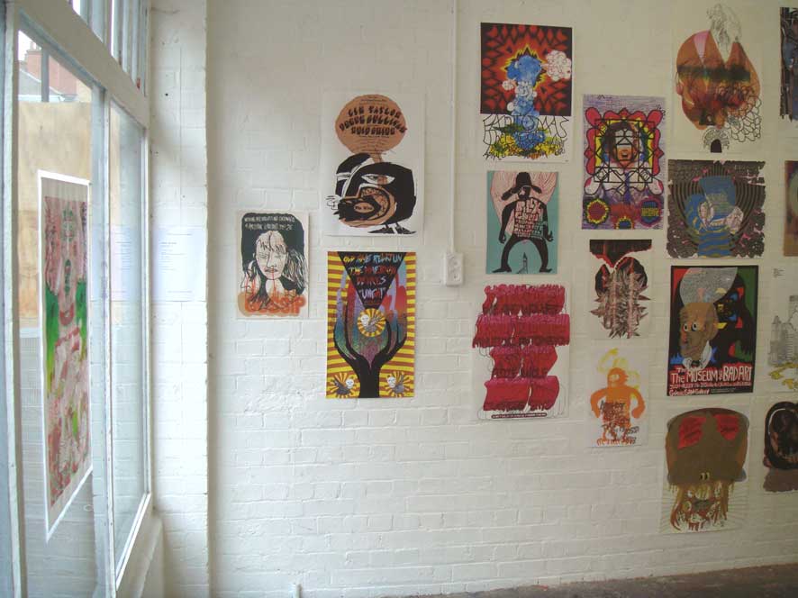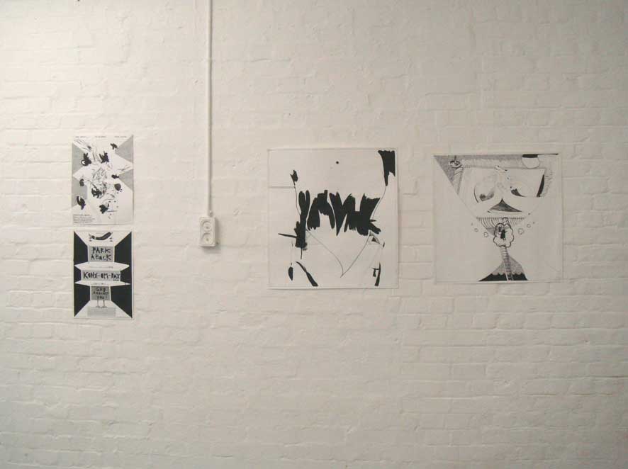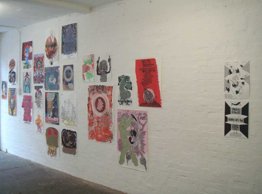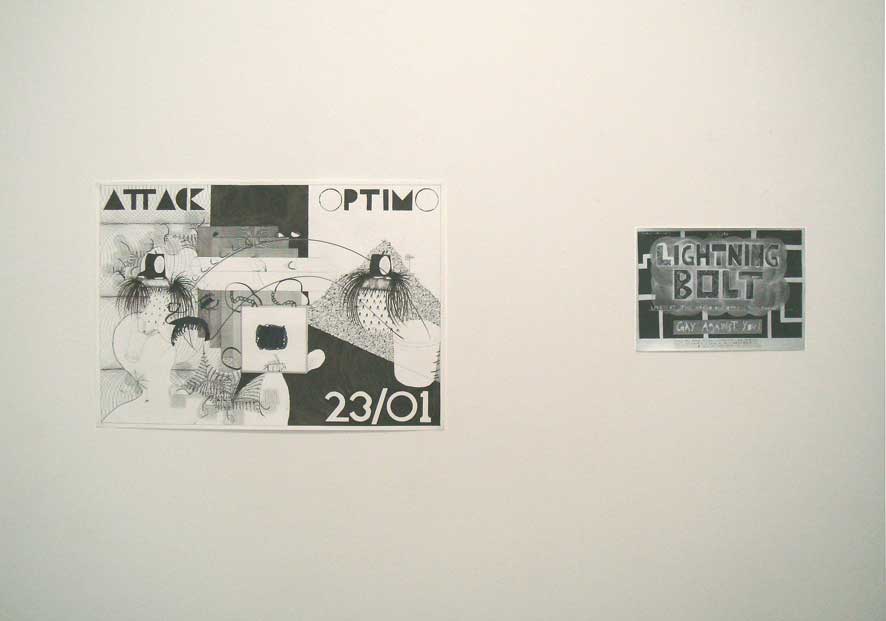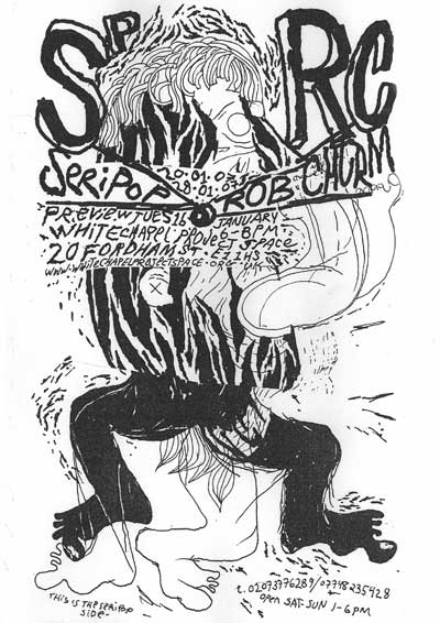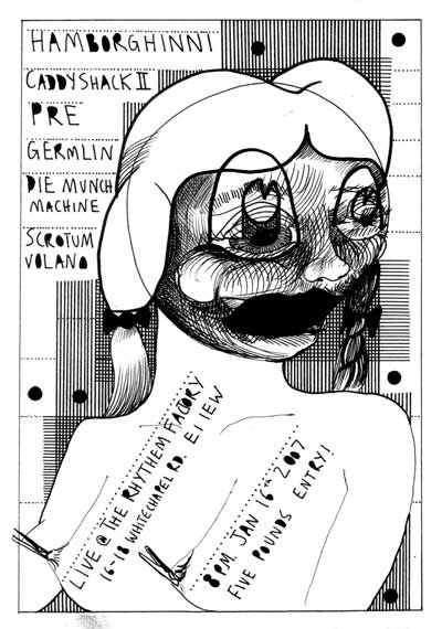 20.01.07 - 28.01.07 Preview Tuesday 16th January 6-8pm followed by; HAMBORGHINNI (Members of Seripop and AIDSwolf) Doors at 8pm, entry £3 Artist duo Seripop (based in Montreal, Canada) and Rob Churm (based in Glasgow) share both an involvement in underground music scenes of harsh noise rock and punkish improv, and the production of drawings and screenprinted posters infected by a rich history of graphic imagery, poster art, graffitismo, and the wild subconscious. Chloe Lum and Yannick Desranleau formed Seripop, a screenprinting shop in Montreal in 2000. Initially mass producing posters, prints and t-shirts for their band AIDS Wolf and now for hundreds of other bands on the American music scene, the posters display a scatological, psychedelic intensity that sits within the warped lineage of Sture Johannesson, Saul Steinberg and Peter Saul. Their abstraction and mutation of classic design styles pulls in the language of underground comics, amateur street graffiti, and the brooding harshness of noise itself to create images that speak of obsession and the warping and patterning of contemporary underground culture. Similarly Rob Churm's drawings and posters often relate to and publicise his own band Park Attack and other bands traveling through Glasgow, yet they also operate with an internal logic of repetition and obsession. Fusing intense geometries reminiscent of schoolbook doodles, and a figuration of mauled cartoon characters, Churm's drawings fluctuate between garish complexity, and the simplicity of his typographic meanderings. The opening of the exhibition on Tuesday 16th January, will be followed by a unique opportunity to see Hamborghinni (Lum and Desranleau) and Park Attack (Churm) side project Caddyshack II play live at The Rhythm Factory on Whitechapel Road. This after party will also feature some of the most exciting and visually visceral members of the punk/noise scene in the UK: PRE, Die Munch Machine (members of Part Chimp), Germlin (Joe from Gay Against You), Scrotum Volcano (members of Yeborobo/Snotty Cock/Shimmy Rivers And And Canal/Sleeping States) who will play on a night that seriously cannot be missed. Seripop/Rob Churm is a collaborative project between Sophie Brown and Whitechapel Project Space. Rob Churm is represented by Sorcha Dallas, Glasgow. | ||||||||||||